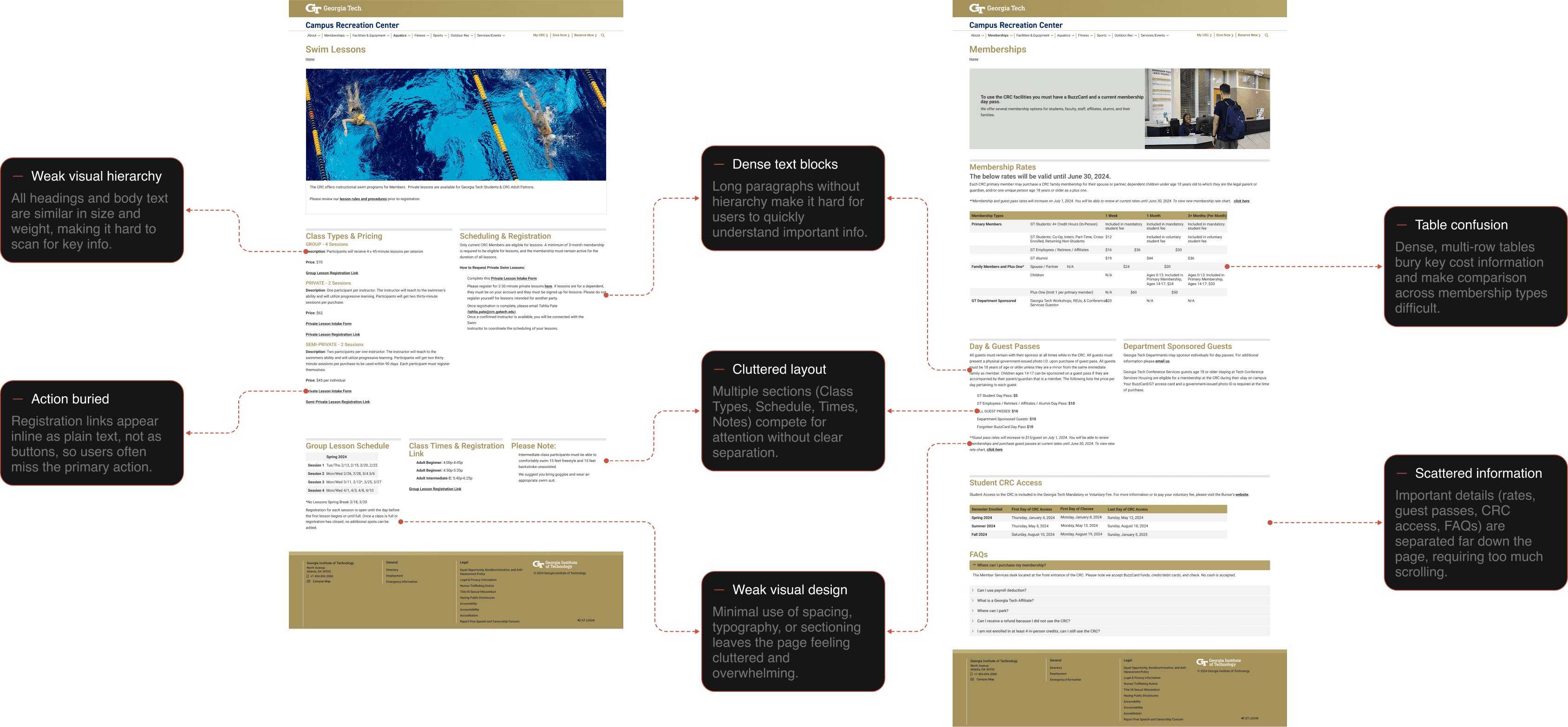 Through our preliminary research and usability audit, we found that the Campus Recreation Center website suffered from inconsistent layouts, text-heavy pages, and inaccessible design patterns. Key actions were hidden within paragraphs, tables were difficult to read, and important details were scattered across multiple sections. These issues created confusion, slowed users down, and often left students uncertain about how to complete essential tasks such as registering for programs or understanding membership options.